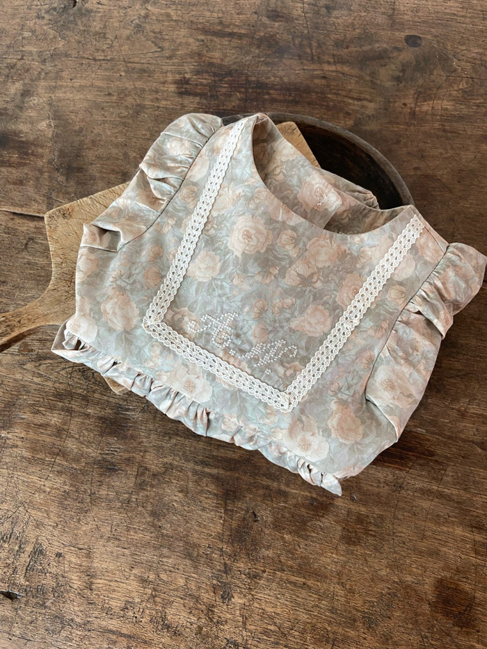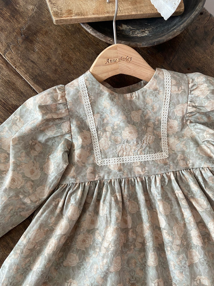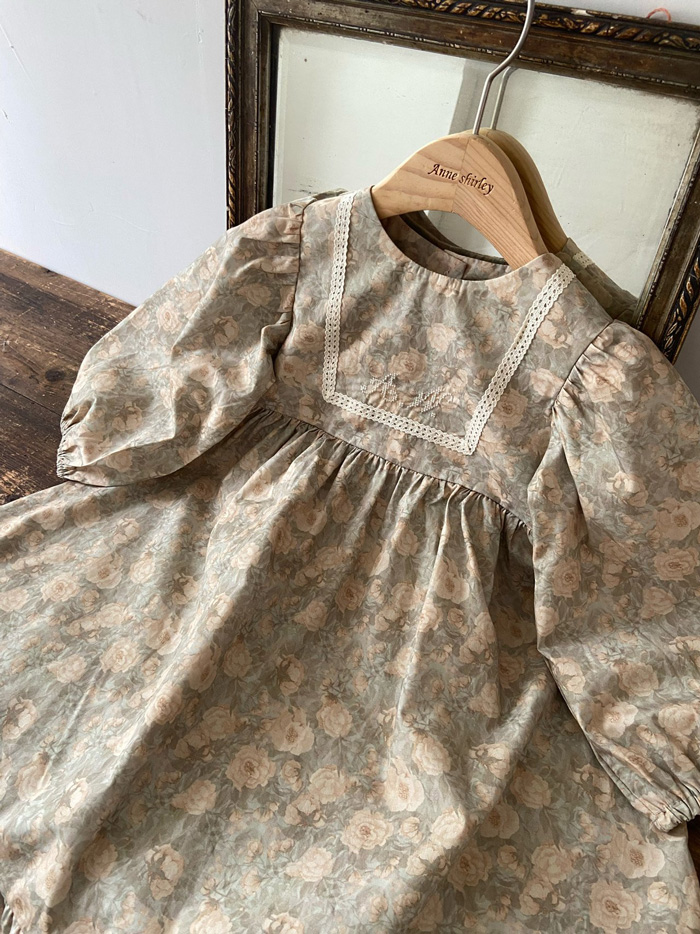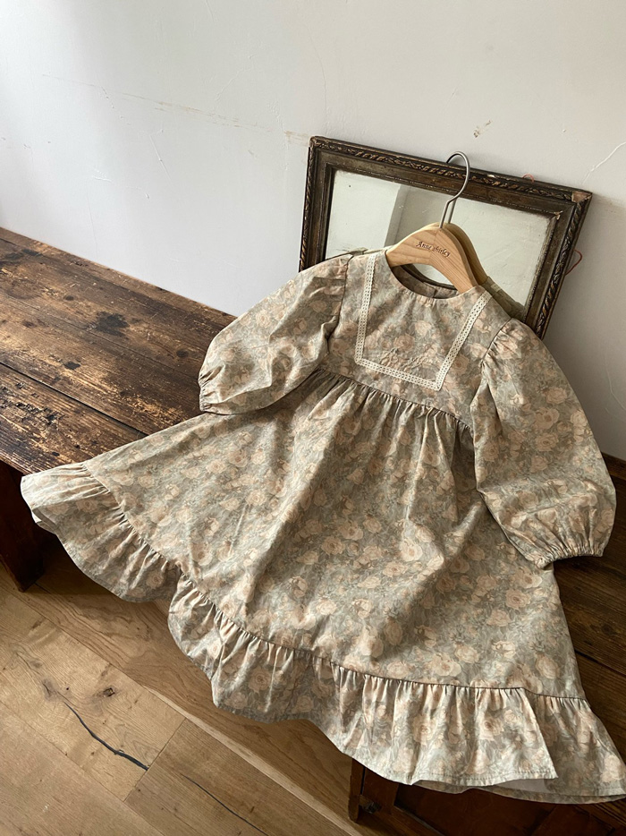 滿版碎花布料,輕盈中帶有復古氣息,方領蕾絲拼接增添細緻感,澎澎袖與荷葉裙襬設計,讓小女孩的日常穿著也能充滿浪漫氛圍。